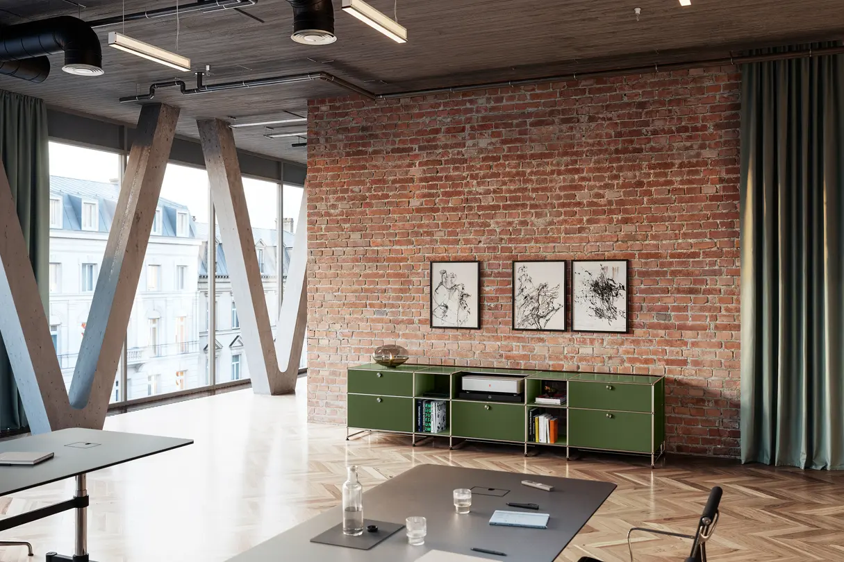 专为现代办公环境打造的 USM 模块化餐边柜系列,可搭配徕卡 Cine 1 使用。该系列为办公空间赋予规整感与精致格调,同时通过雅致的面板系统,巧妙隐藏线缆、接口及各类科技设备。