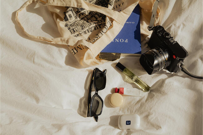 不工作的时候,我只携带非常少的物件在身边,通常只带手机、AirPods、润唇膏、腮红和一瓶旅行装的香水。根据天气情况,有时我还会带上一副太阳镜,拿上一本小书。