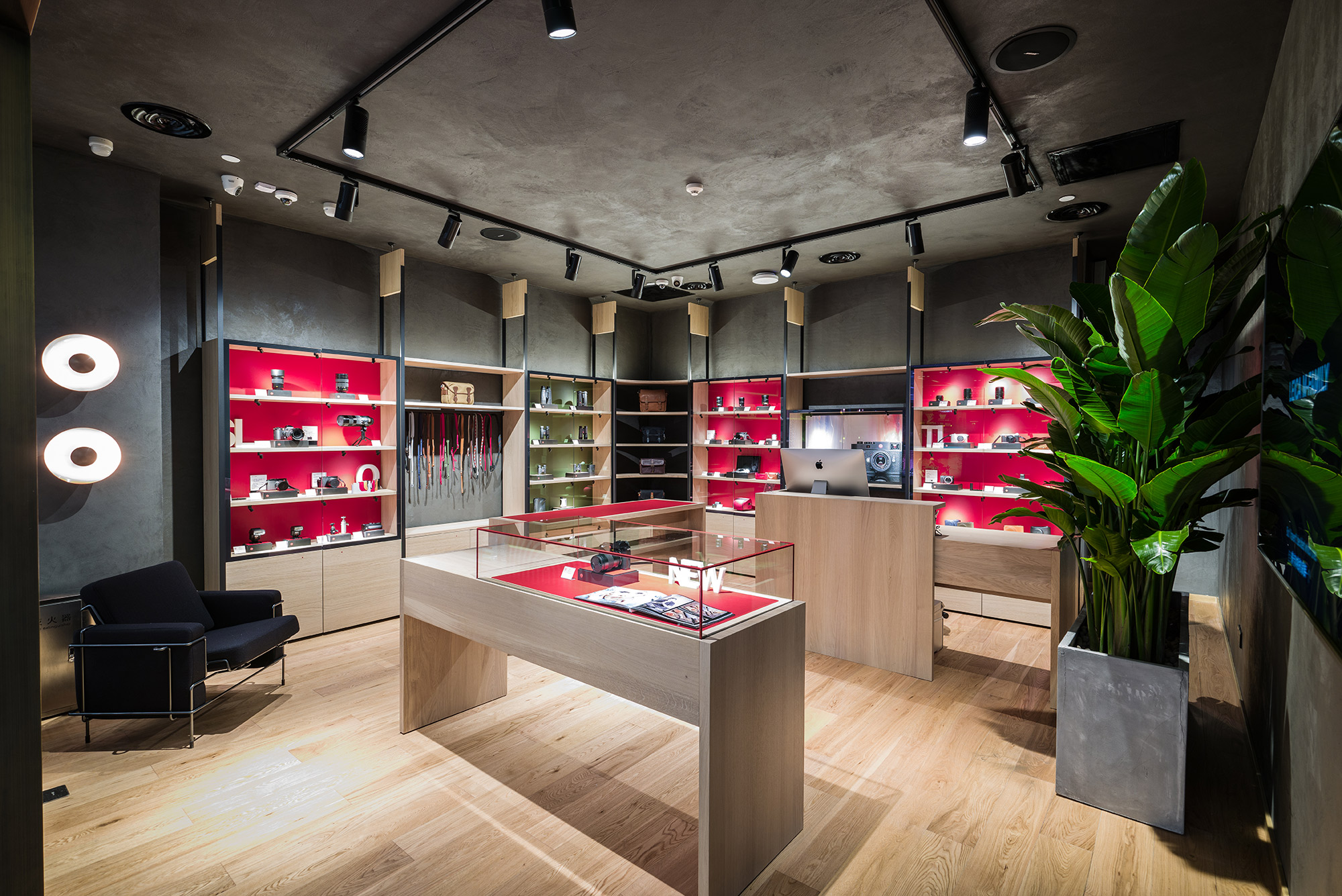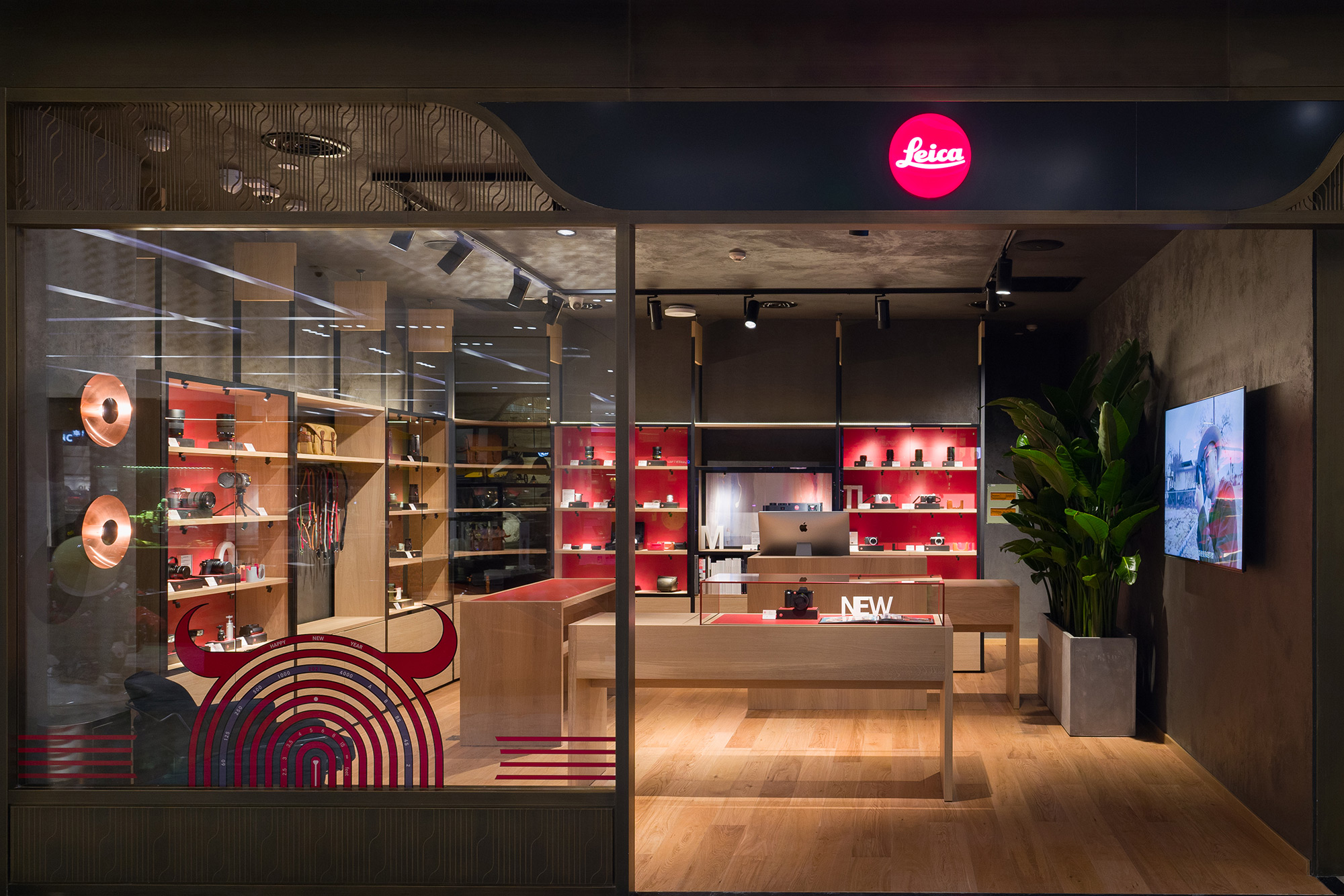 徕卡北京SKP旗舰店外观选用石墨灰色质感漆面,店内整体装饰采用木色基调,彰显低调与优雅内涵,而门店入口的新春定制牛年图案,灵感来自徕卡相机镜头元素,透露着设计趣味与巧思。设计灵感来自摄影师的家居环境的角落配有沙发,供顾客品鉴之余可以稍作小憩,享受如家般的舒适与温馨。